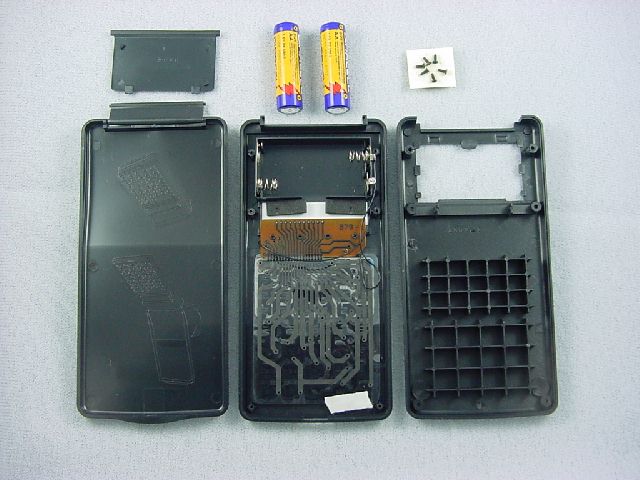 The fold-over cover (left), case front and electronics (center), and case back (right). The PCB is held in place with four screws to hold a zebra strip against the display. The PCB has been warped by the pressure of the screws. Five of the six screw holes for the screws that are supposed to hold the case together were stripped. |
