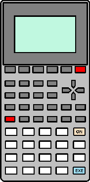 WARNING: Invoking the test described below will result in the clearing of data memory, program memory, and mode settings. The CFX-9850G has built-in internal, display, and keyboard tests. With the calculator off, the test mode is activated by pressing and holding the F6 and a b/c keys (the two keys highlighted in red on the illustration above), then pressing the AC/ON key. A menu of test options is presented. Each test is activated by pressing the number for the appropriate test. Contrast Test. The contrast display test, test number 1, is activated by pressing the EXE key. For approximately 10 seconds the contrast will automatically change. At the end of the test, the "INIT" and "IN-A" prompts will appear in the lower left corner of the display. The contrast test is exited by pressing the EXIT key, which returns you to the test options menu. (NOTE: if the contrast test is run after the RAM test, the calculator will lock up, necessitating a hard reset using the reset button on the back of the calculator). Display Test. The pixel display test, test number 2, requires pressing the EXE key to step through each display pattern until the test option menu is again displayed. Keyboard Test. The keyboard test, test number 3, requires the pressing of each key in order, generally from the upper-left, to the lower-right. The calculator prompts you to press the appropriate key. ROM and RAM Tests. The ROM and RAM tests, test numbers 6 and 7, will display "ROM OK" or "RAM OK," as appropriate, when the test finishes successfully. The EXE key must be pressed to return to the test option menu. Tests numbers 4 and 5 are exited by pressing the AC/ON key. The test mode is exited by selecting option zero. You must additionally answer "yes" (by pressing F1) to the "reset all memories?" prompt (the calculator will eventually lock-up if you answer "no," necessitating a hard reset using the reset button on the back of the calculator). |