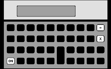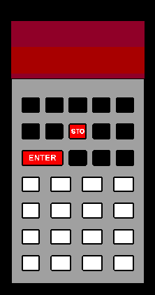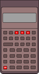 The Pioneer series calculators, which include the HP-10B, HP-14B, HP-17B, HP-17BII, HP-20S, HP-21S, HP-22S, HP-27S HP-32S, HP-32SII, and HP-42S all have built-in internal, display and keyboard test functions. The keystrokes to access the self-test functions of each calculator are the same for all pioneer models (ignoring the keyboard nomenclature for each specific model). A continuous internal/display test is performed by simultaneously pressing the ON key (labeled "C", "CLR" or "EXIT" on various models) and the key labeled "E" (the fifth key on the top row) in the illustration at the right. Various internal and display tests will be performed until interrupted by simultaneously pressing the key labeled "C" (the third key on the top row) in the illustration at the right and the ON key. The more thorough internal/display/keyboard test is performed by pressing the ON key and the key labeled "D" (the fourth key on the top row) in the illustration at the right. Press any key to step through the various display and internal tests until after the copyright notice is displayed. "KBD" on calculators with alpha-numeric display capability or "01" on calculators with only a numeric display will be displayed to indicate the start of the keyboard test. In order press each key from left to right on each row, from the top row to the bottom row. The calculator will indicate "OK" or "good" when the keyboard test is successfully completed. If a key is pressed out of order or there is a keyboard problem, and error message will be displayed. This test can be interupted at any time as described above. |