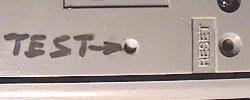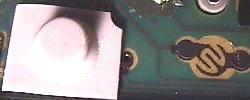 I chose to make a minor modification to my calculator to facilitate access to the test function. I first drilled a small hole though the plastic back body directly over the TEST pad. This hole is approximately the same size as the hole for the reset button. Then, I then affixed a rubber key dome with its conductive black pad, (taken from a dead calculator) over the TEST pad with double-sided tape. Finally, I replaced the back body of the calculator. Note, I did not drill a hole in the metal battery compartment cover. (Based on several factors, I believe this calculator was manufactured by Casio, is functionally identical to the Casio fx-6300G.) |