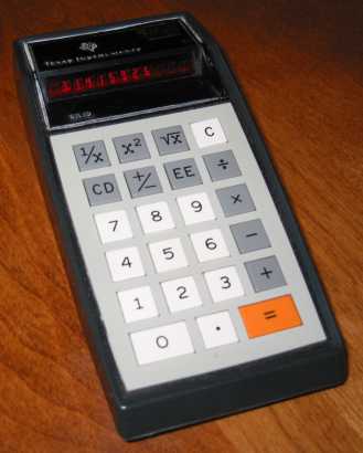 This machine is a nice, working example of an early "slide rule" calculator, the SR-10 from Texas Instruments. More than four-function machines, but less than full-fledged scientific calculators, machines like the SR-10 often had some scientific functionality, including an exponential display, but missing other essential functions such as exponentials, logarithms, or trigonometrics.
